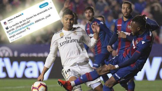 马竞官推则直接开怼:奥斯卡大秀上演,无限循环的故事。在马德里德比中,维尼修斯禁区外摔倒拿到点球,裁判漏判卡塞米罗禁区内对莫拉塔的犯规,又吹掉了莫拉塔的单刀破门。