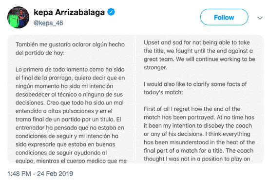 在推特上,凯帕还写道:我对比赛最后发生的一切被渲染成现在这样感到懊悔。我从未想违背教练或者教练的决定。我绝对不想事情变成现在这个样子。我对教练和他的权威持有完全尊重的态度。