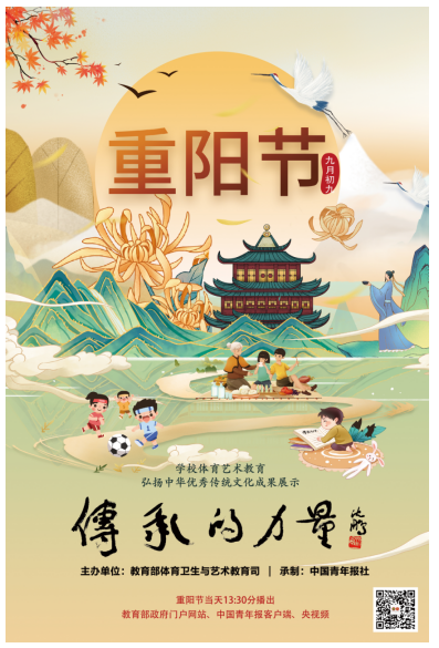 “秋变铜池色,晴添银树光。年年重九庆,日月奉天长”。重阳节这个延续了数千年的中华传统节日,在今天依然焕发出迷人的光彩。这一天,师生们登高远眺,赏金秋红叶,祭先祖,庆丰收,天高地远,山高水长。“重阳节”已经长久的涌动在每一个中国人的心中。2021年,由教育部主办的《传承的力量——学校体育艺术教育弘扬中华优秀传统文化成果展示活动》系列节目,再度启程,于重阳时节,走进校园,助推中华优秀传统文化发展创新。