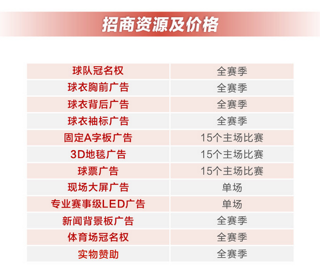 2月12日讯今天,中甲升班马四川安纳普尔那队公布了新赛季的招商方案,据招商方案公告显示,俱乐部将在新赛季队球队冠名权、球衣胸前广告、背后广告、体育场冠名、球票广告等12项资源进行招商。