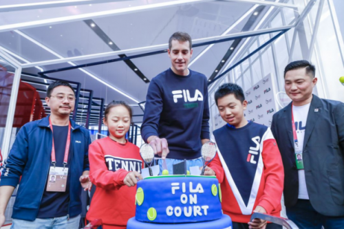 FILA向约翰·伊斯内尔赠礼(左)与小球员切蛋糕庆祝(右)