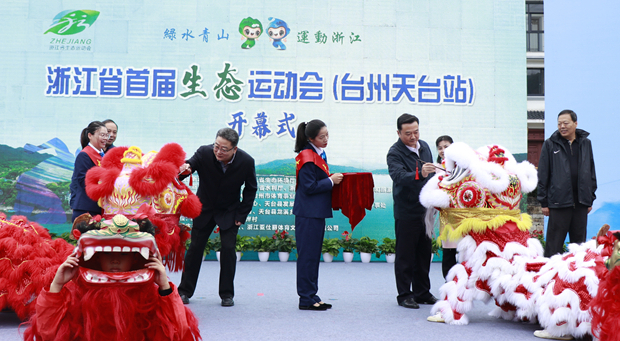 随着浙江省体育局副局长张亚东,天台县委副书记、代县长崔波为舞狮点睛,浙江省首届生态运动会(台州天台站)比赛正式启动。