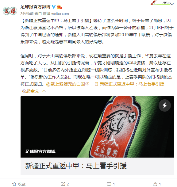 足球报:新疆递补毅腾重返中甲,将马上着手引援